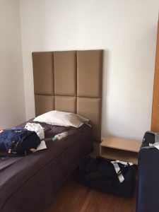 お部屋はフローリングで掃除もしやすく、比較的きれいでした。(私の荷物が粗雑にベッドに投げられているのは見ないふりをしてください)