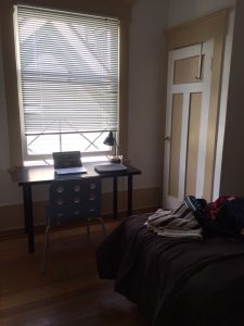 寮はアパートのようになっていて、一つの部屋に1人部屋が1つと2人部屋が1つ、キッチンとバスルームがあります。ちなみに私は1人部屋に住んでいました。お部屋はこんな感じでベッドと机、ちょっとした収納スペースがあります。